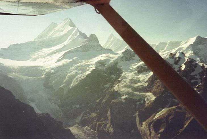 What lies behind the mountain wall. Photo taken Adrian's son - Julian - when aged nine. Have a look at www.theurbanimage.co.uk to see what he photographs today. Take off early and you might catch the Swiss. The local mountain rescue helicopter passing the base of the Jungfrau, a grim shoulder resembling a massive wall and known locally as the Black Monk.