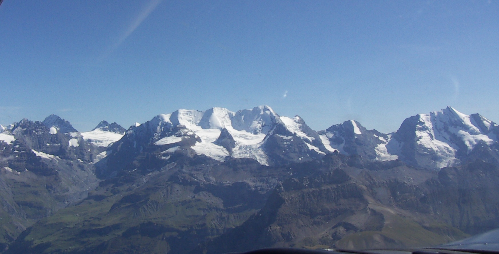 Glaciers along the Diamond Peaks. From left the Wetterhorn, Eiger, Monch, Jungfrau, Blumlisalp and Balmhorn. Folds in the rock, clearly visible, show how the Alps came about after a collision of continents. Such photos are possible only from an aircraft. This photo, taken after summer, certainly is worth comparing with those on the Alps Tour Page - taken during several summers over the last three decades.