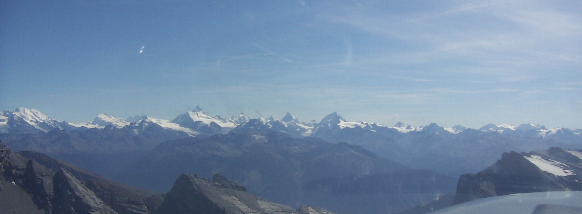 The big four - Switzerland's highest peaks in Canton Valais where 38 summits rise over 4000 metres. Slightly left of centre are the Dom and Monte Rosa - rising to 14,911 feet and 15,203 feet. At photo centre is the Matterhorn 14,692 feet and the Dent Blanche 14,291 feet.