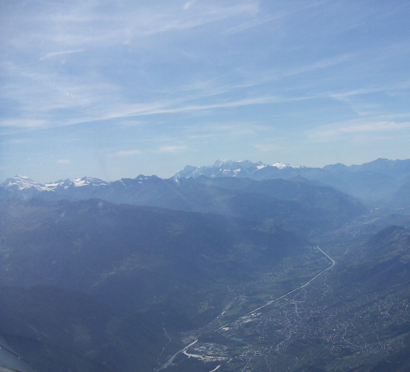 The Rhone flowing from the Alps towards Geneva. The mighty barrier ahead spreads from Grand Combin and the Dents du Midi to the great massif formed by Mont Blanc - almost enclosing the beautiful Lake of Geneva before the Rhone escapes through France and eventually reaches the warm Mediterranean.