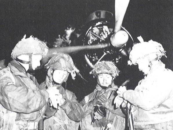NORMANDY COAST AHEAD Captain Frank L Lillyman, commanding the 101 Airborne Division's Pathfinder Detachment, landed ahead of the entire invasion at 15 minutes past midnight as first liberator on the ground in Normandy. The photo below right shows the British pathfinders - Bobby deLatour, Don Wells, John Vischer and Bob Midwood - synchronising their watches before leading the 6th Airborne Division into occupied Europe. Bobby deLatour's boots touched down on the Normandy turf at about 18 minutes past midnight. The British gliders landed beside Pegasus Bridge around 30 minutes past midnight.