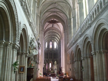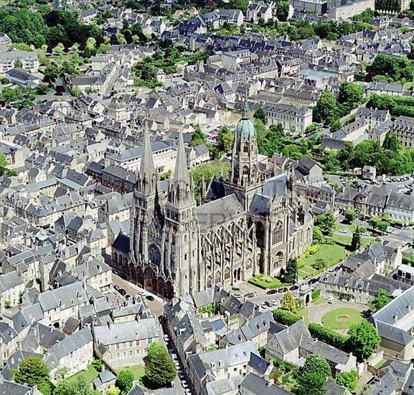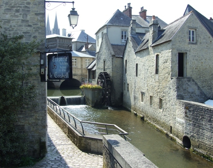 Bayeux Cathedral and the River Aure flowing through the city centre.